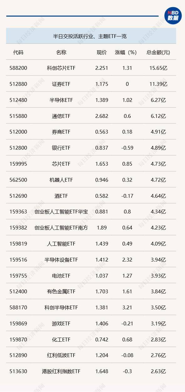11月28日上午,半导体与证券相关ETF交投相对活跃,其中,科创芯片ETF(588200)半日成交金额为15.65亿元,证券ETF(512880)半日成交金额为11.39亿元。跨境ETF方面,港股市场相关ETF交投缩量显著,无一只ETF半日成交金额达35亿元。