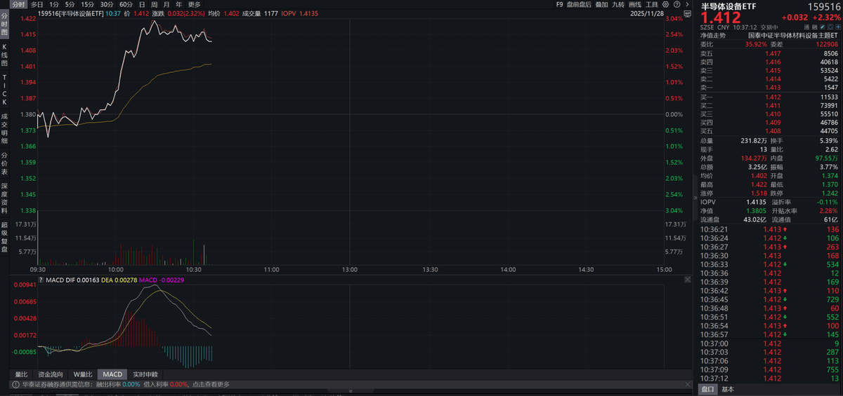 11月28日,谷歌叙事持续发酵,AI景气度持续上行,聚焦上游半导体设备领域的半导体设备ETF(159516)盘中领涨超2.3%