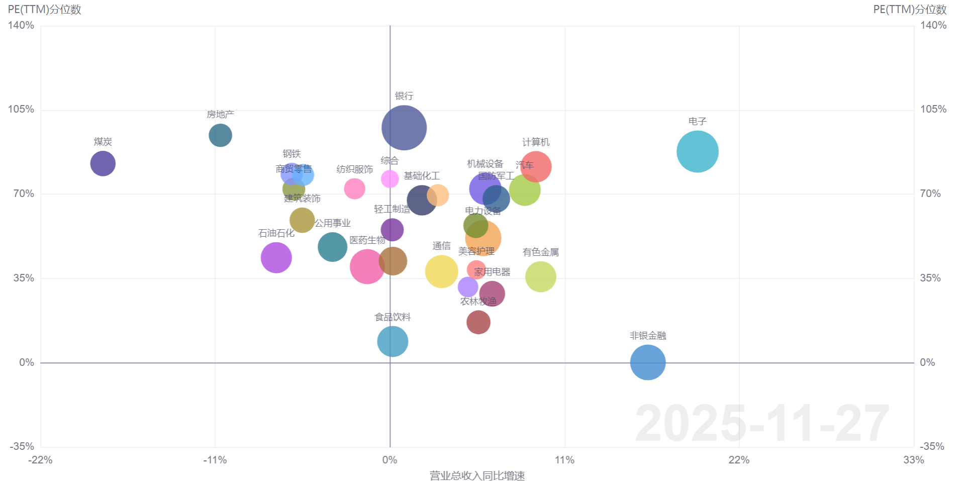 而如果配合上整体的盈利状况,我们就可以得到以下表格:X轴代表行业营收总收入增长,而Y轴则是PE(TTM)的估值分位数。