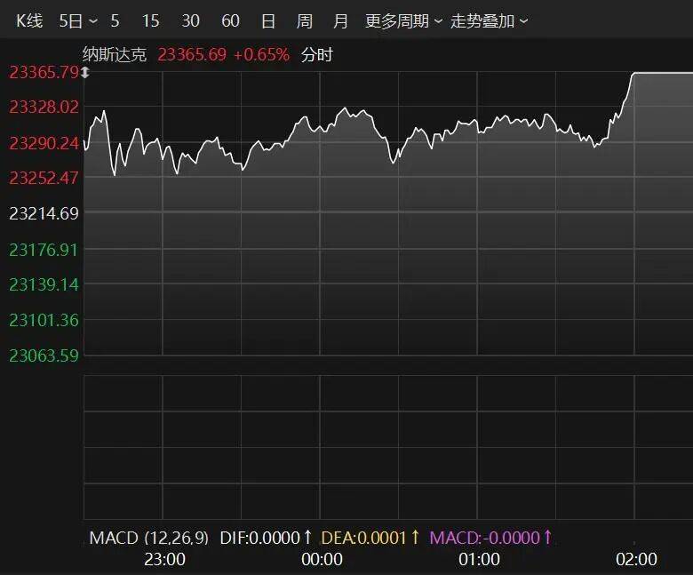 截至收盘,三大指数连续第五个交易日集体收涨,纳指涨0.65%,道指涨0.61%,标普500指数涨0.54%。