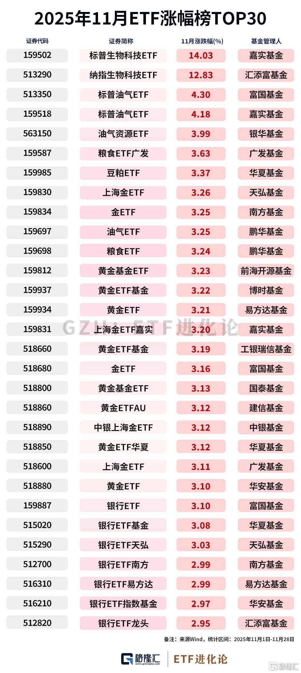 11月的ETF市场,生物科技领域迎来强势反弹。标普生物科技ETF单月上涨14.03%,纳指生物科技ETF上涨12.83%,展现出这一细分领域的强劲势头。