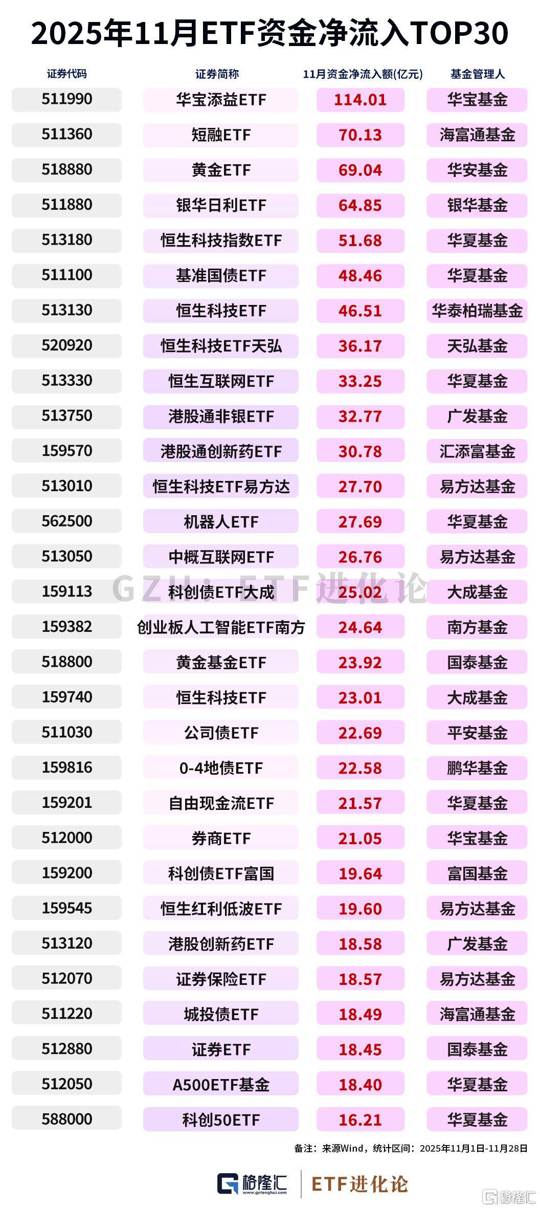 11月单月资金流向榜单,揭示出投资者在年末的谨慎心态。华宝添益ETF净流入114亿元,短融ETF净流入70亿元,银华日利ETF净流入64亿元,货币基金、债券基金成为资金“避风港”。