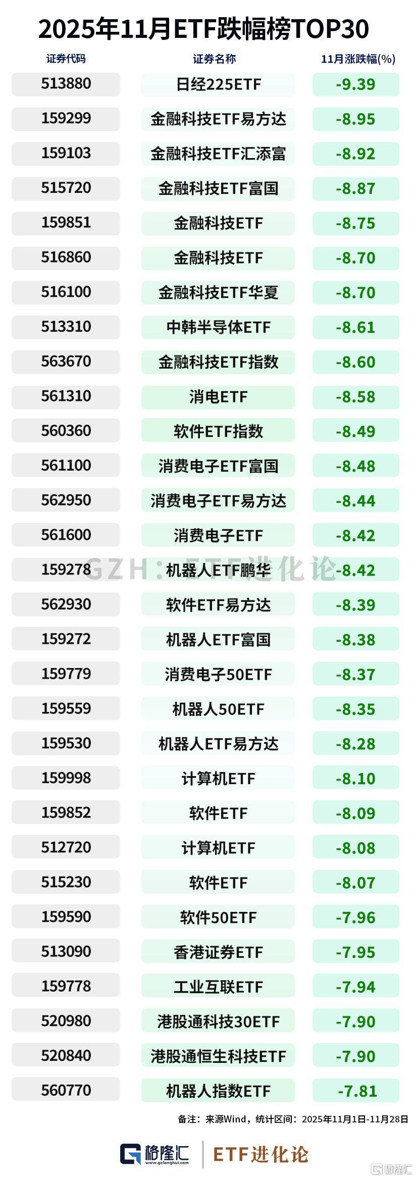 相比之下,11月的跌幅榜呈现另一番景象。日经225ETF下跌9.39%;金融科技板块遭遇集体回调,金融科技ETF下跌8.92%;消费电子、机器人、软件等硬科技板块同样表现疲软,跌幅普遍在8%以上。