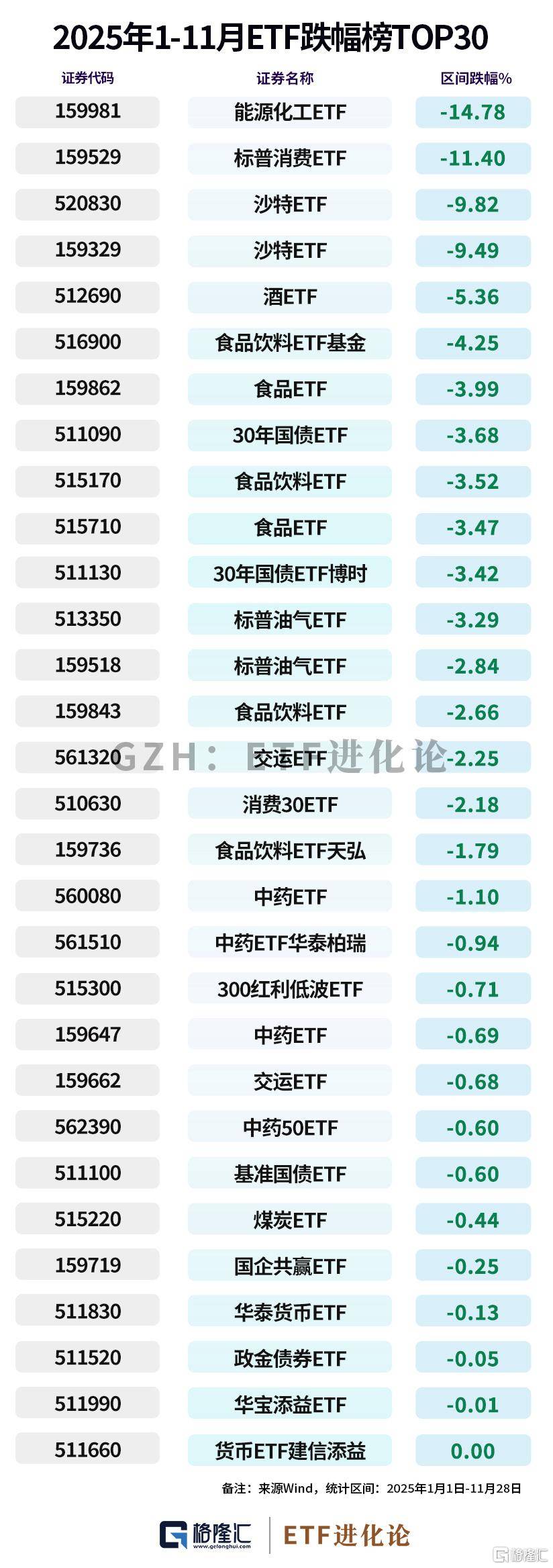 年内跌幅榜,能源化工ETF下跌14.78%,标普消费ETF下跌11.40%,显示传统消费和能源板块面临压力。