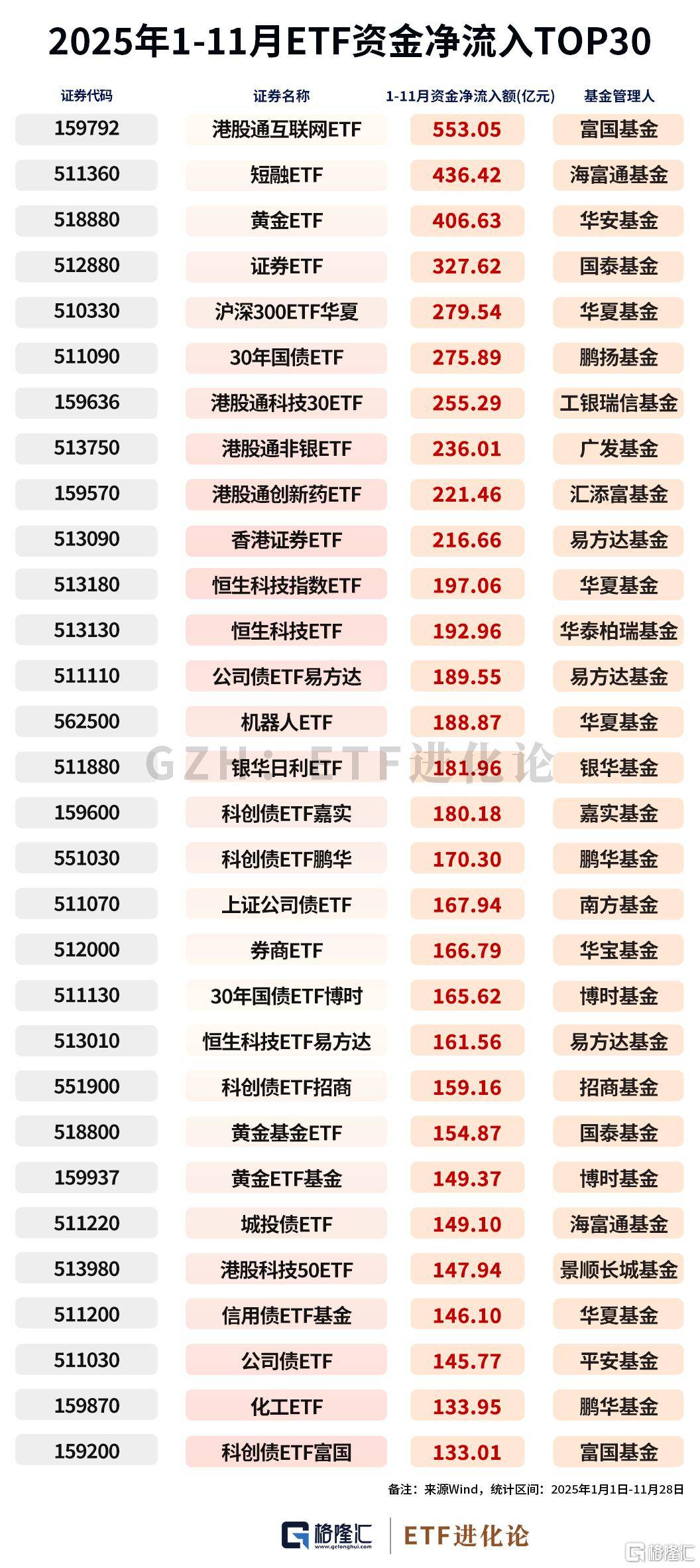纵观2025年前11个月,港股通互联网ETF以553.05亿元的净流入额位居榜首,展现出市场对港股科技板块的强烈信心;短融ETF净流入436.42亿元,黄金ETF净流入406.63亿元。