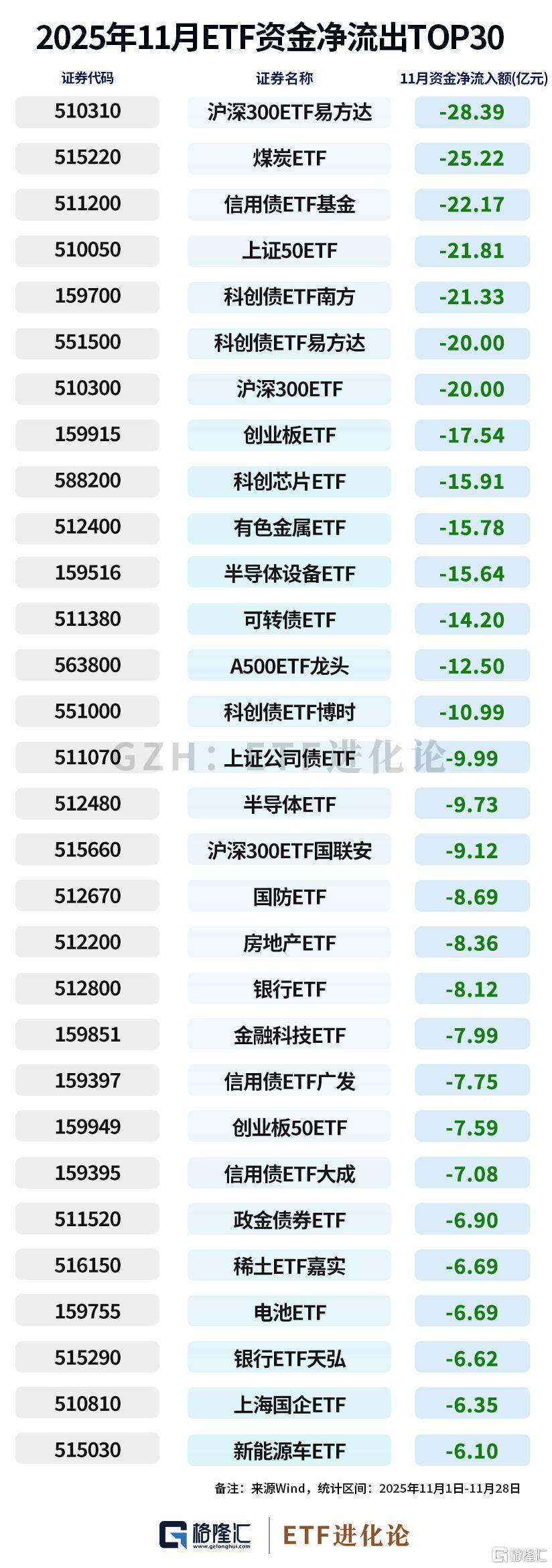 资金流出端,沪深300ETF易方达净流出28.39亿元,煤炭ETF净流出25.22亿元,上证50ETF净流出21.81亿元。