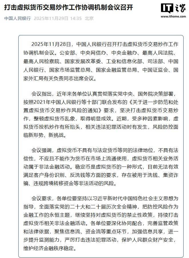 IT之家 11 月 29 日消息,据“中国人民银行”公众号,2025 年 11 月 28 日,中国人民银行召开打击虚拟货币交易炒作工作协调机制会议。