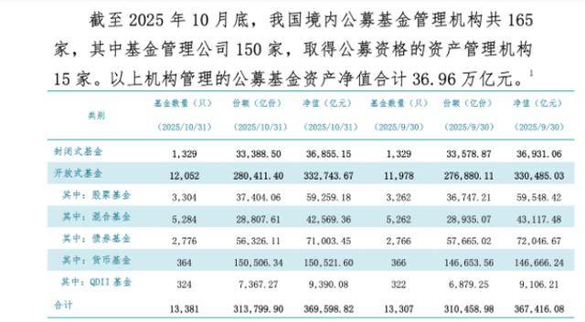 11月28日,中国证券投资基金业协会发布最新一期公募基金市场数据。数据显示,截至2025年10月底,我国境内公募基金管理机构共165家(其中基金管理公司150家,取得公募资格的资产管理机构15家),所管理的公募基金资产净值合计达36.96万亿元,连续第七个月创出历史新高,规模已逼近37万亿元。
