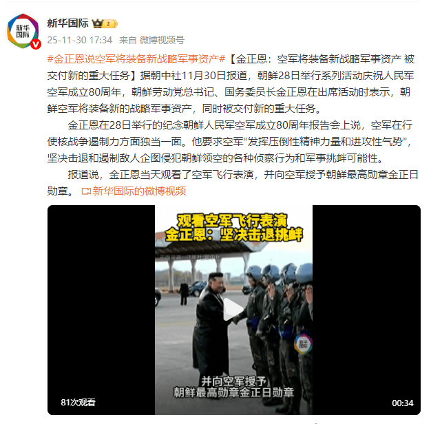【金正恩:空军将装备新战略军事资产 被交付新的重大任务】据朝中社11月30日报道,朝鲜28日举行系列活动庆祝人民军空军成立80周年,朝鲜劳动党总书记、国务委员长金正恩在出席活动时表示,朝鲜空军将装备新的战略军事资产,同时被交付新的重大任务。