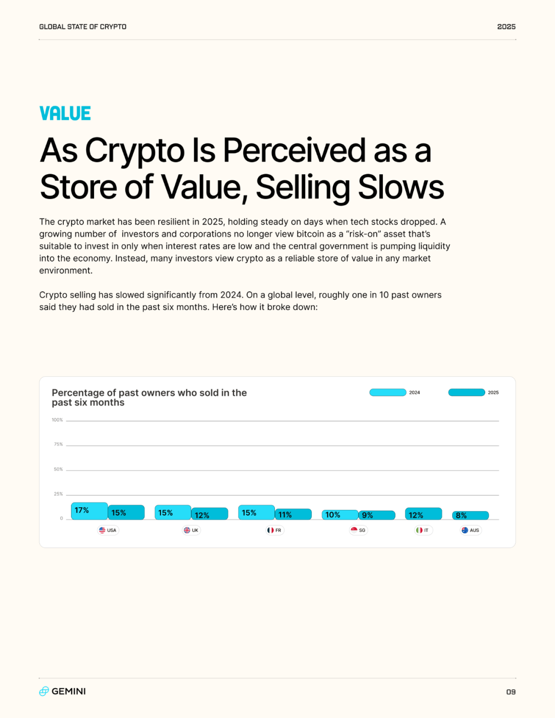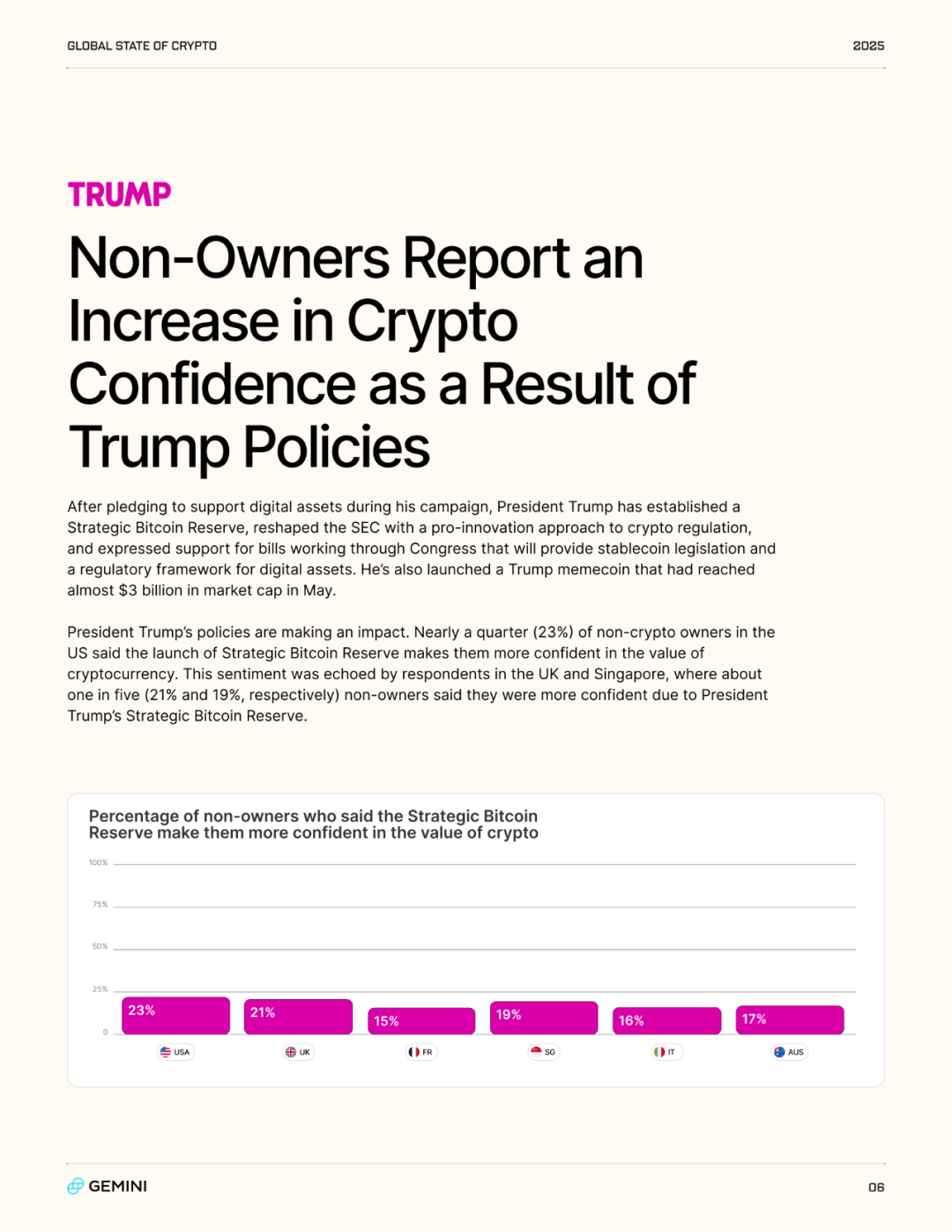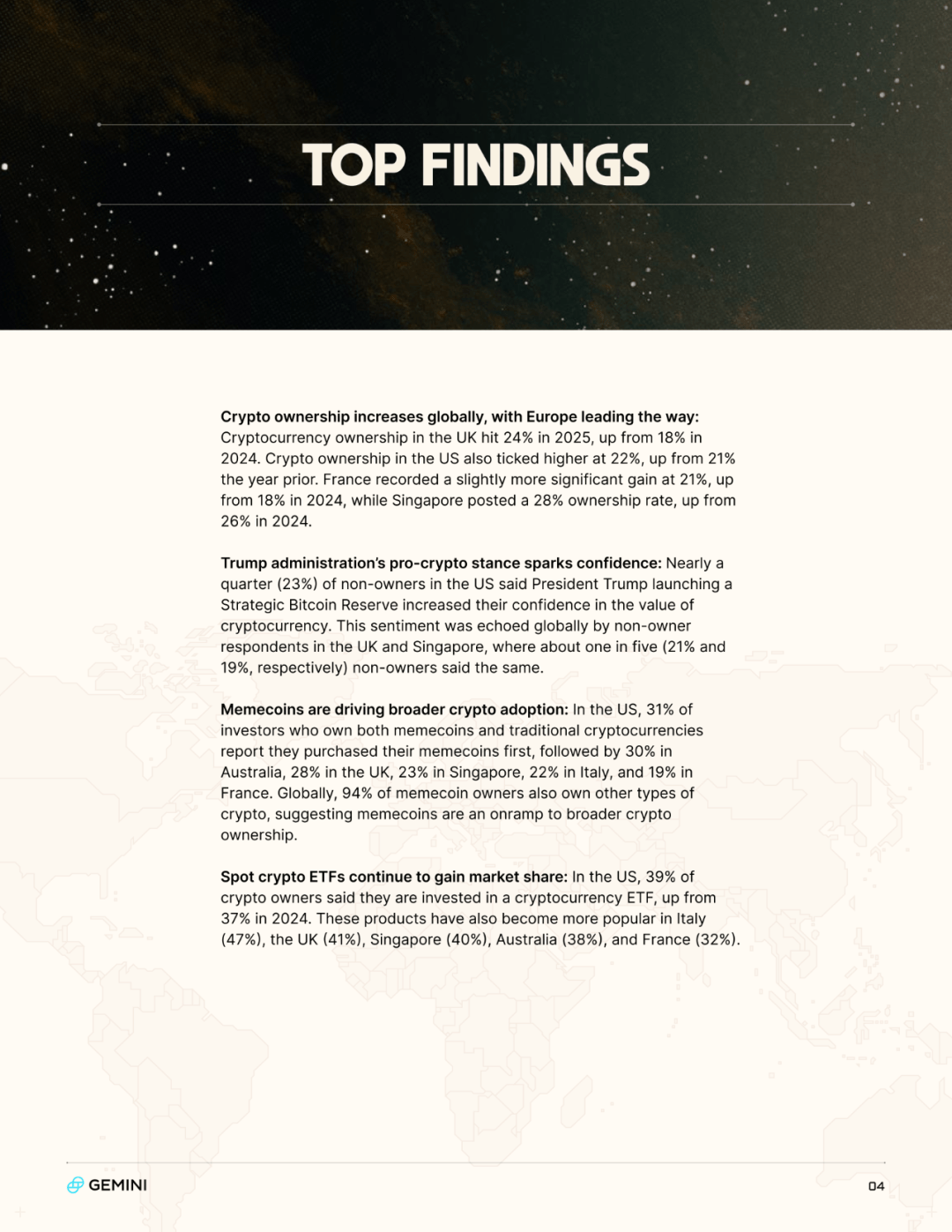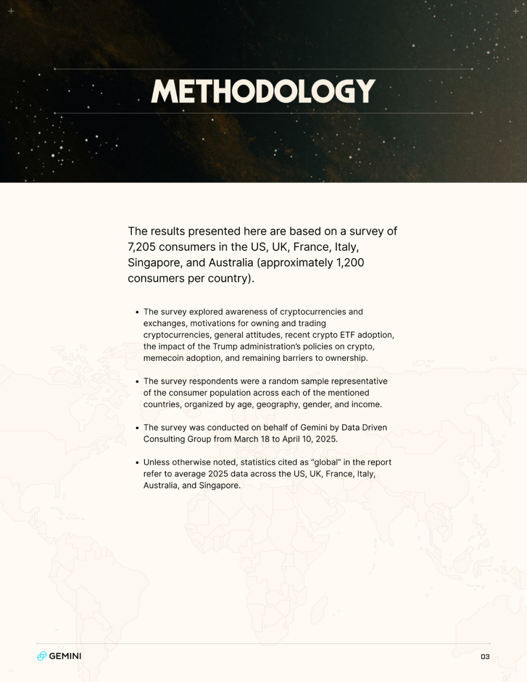 Gemini发布的《2025年全球加密货币市场报告》基于美、英、法、意、新加坡、澳大利亚六国7205名消费者的调研数据,全面呈现了加密货币市场的发展趋势与特征。