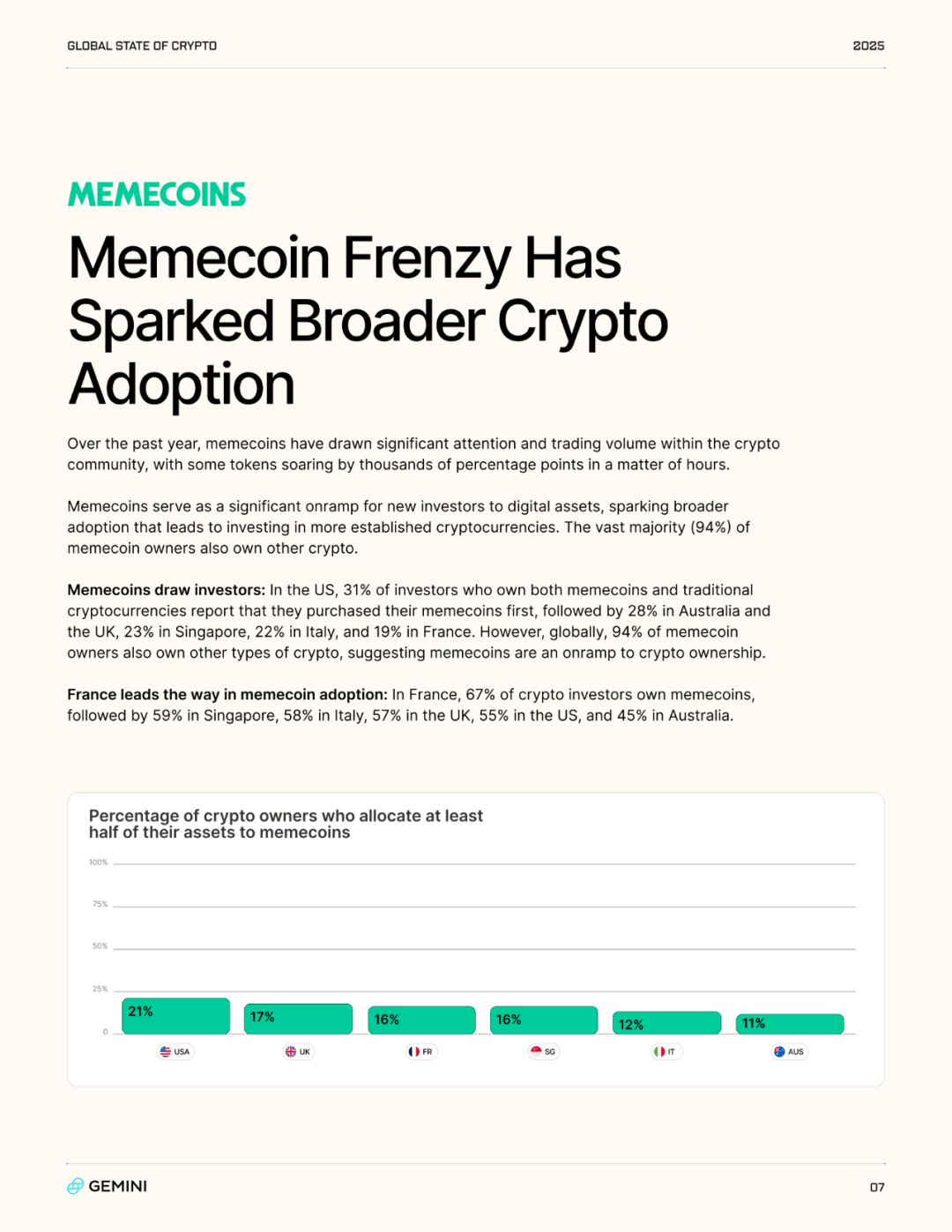 迷因币(Memecoins)成为加密货币普及的重要入口。六国中94%的迷因币持有者同时持有其他类型加密货币,美国31%的混合持有者先购买迷因币,澳、英两国这一比例均为28%。法国迷因币 adoption 率最高,67%的加密投资者持有迷因币,新加坡、意大利紧随其后,分别为59%和58%,彰显其对新投资者的吸引力。
