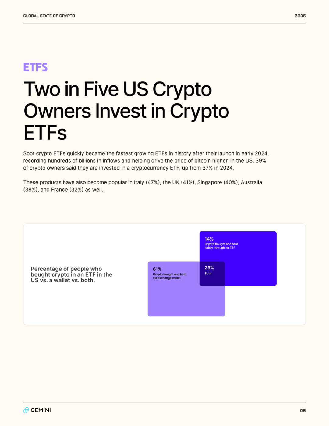 政策与产品创新成为市场重要驱动力。美国特朗普政府采取积极支持加密货币的政策,设立战略比特币储备,调整证监会监管思路,支持稳定币立法,极大提振了市场信心。23%的美国非持有者表示该储备计划增强了他们对加密货币价值的信心,英、新两国也有21%和19%的非持有者持相同态度。此外,现货加密货币ETF持续扩容,美国39%的加密货币持有者参与投资,意大利、英国、新加坡的参与率分别达47%、41%、40%,推动加密资产与传统金融体系进一步融合。