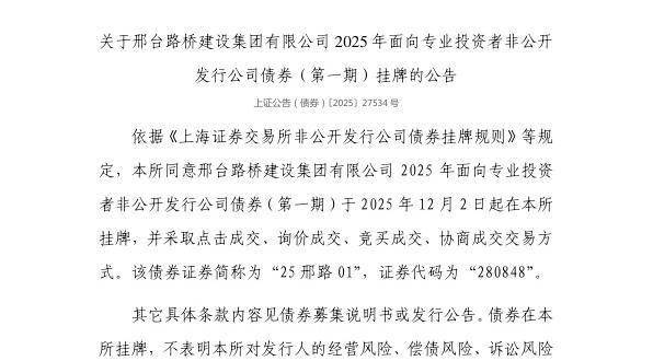 12月1日,上交所发布关于邢台路桥建设集团有限公司2025年面向专业投资者非公开发行公司债券(第一期)挂牌的公告。