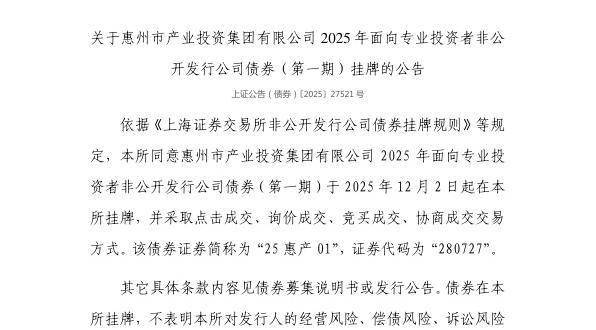 12月1日,上交所发布关于惠州市产业投资集团有限公司2025年面向专业投资者非公开发行公司债券(第一期)挂牌的公告。