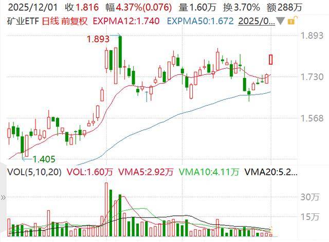 12月1日,A股白银、铜等金属板块集体大涨,湖南白银(002716.SZ)、白银有色(601212.SH)、江西铜业(600362.SH)、兴业银锡(000426.SZ)等多股涨停,云南铜业(000878.SZ)、洛阳钼业(603993.SH)、铜陵有色(000630.SZ)、紫金矿业(601899.SH)等涨超7%。矿业ETF(159690)高开高走,截至发稿上涨4.37%。