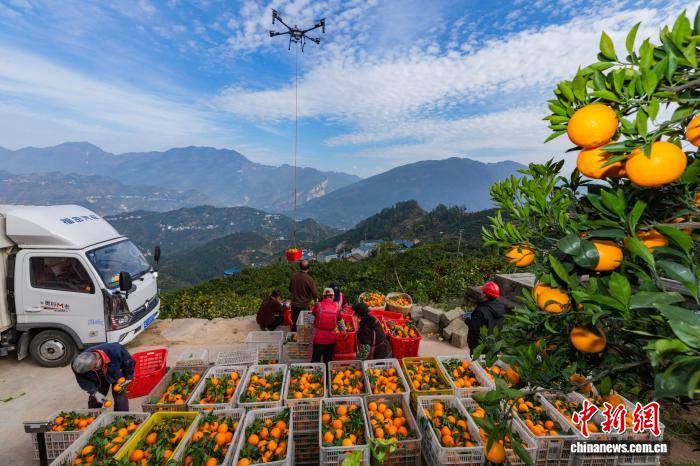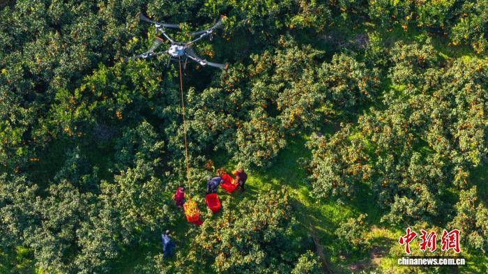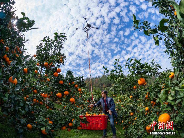 入冬以来,“中国脐橙之乡”湖北省秭归县40余万亩脐橙陆续成熟,金色果实缀满枝头,果农们抢抓晴好天气全力投入采收作业。秭归地处三峡工程坝上库首,是全国县域最早实现一年四季有鲜橙供应的柑橘产区。秭归脐橙年产量稳定在100万吨以上,综合产值约200亿元,脐橙产业已成为当地强县富民的主导产业。图为果农利用无人机吊运鲜橙。彭强 摄