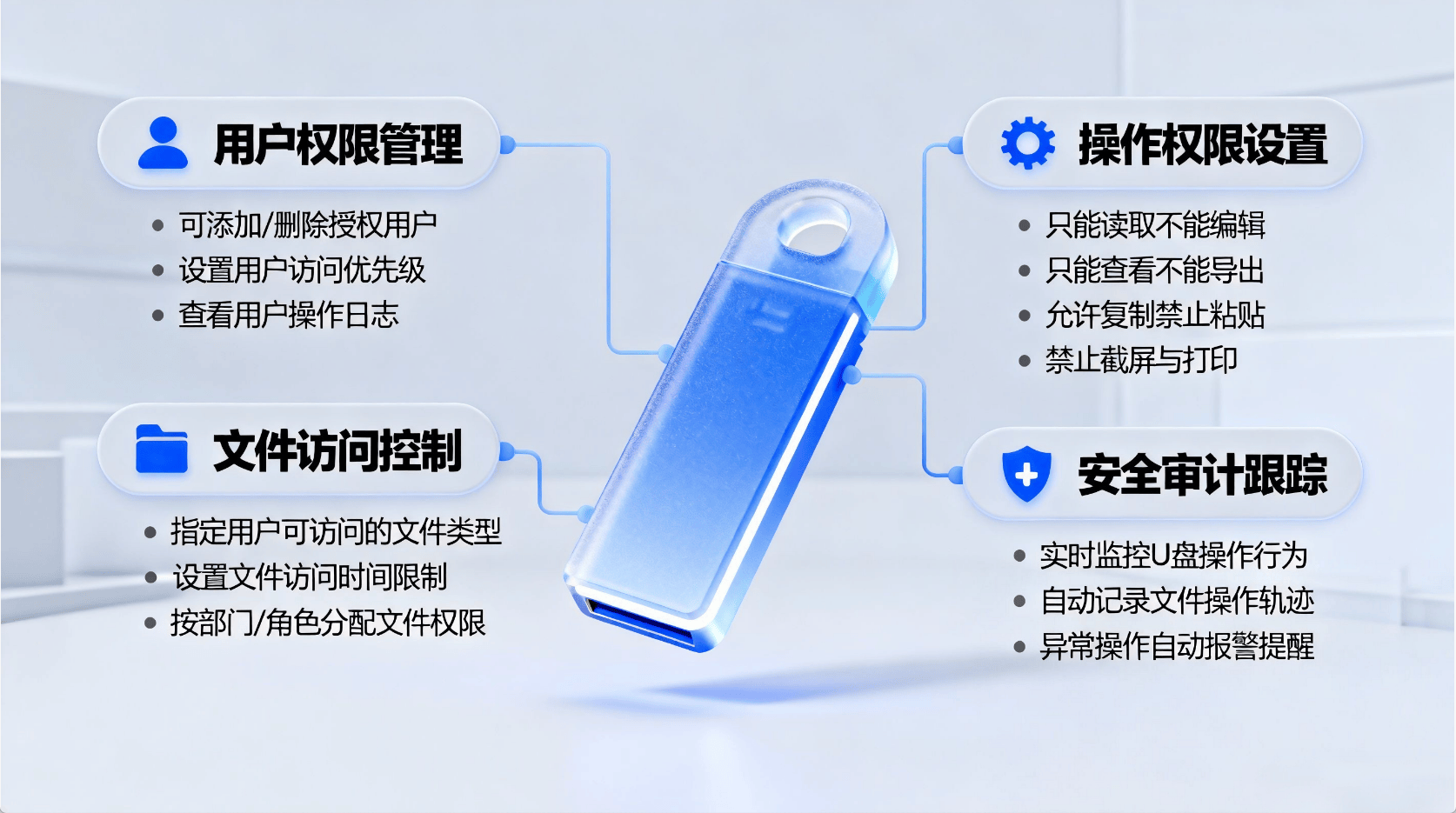 终端与外设一体化管控,USB 分级授权,未授权设备接入即禁用。全盘加密 + 文件加密双模式,软件安装管控,防范设备滥用与资产流失。