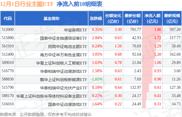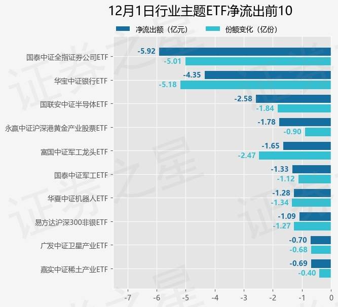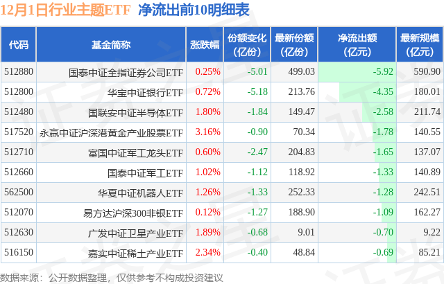 当日有141只行业主题ETF基金出现资金净流出,其中净流出排首位的是国泰中证全指证券公司ETF(512880),份额减少了5.01亿份,净流出额为5.92亿元。