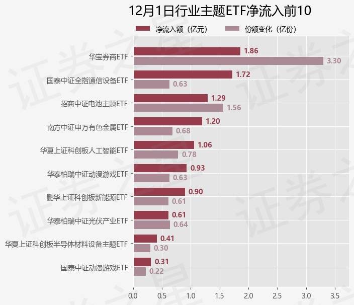 当日有66只行业主题ETF基金出现资金净流入,其中净流入排首位的是华宝券商ETF(512000),份额增加了3.3亿份,净流入额为1.86亿元。