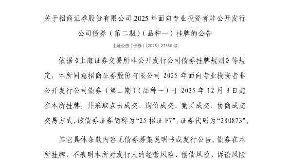 12月2日,上交所发布关于招商证券股份有限公司2025年面向专业投资者非公开发行公司债券(第二期)(品种一)挂牌的公告。