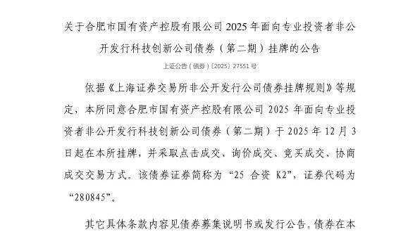 12月2日,上交所发布关于合肥市国有资产控股有限公司2025年面向专业投资者非公开发行科技创新公司债券(第二期)挂牌的公告。