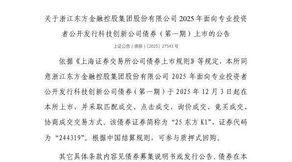 依据《上海证券交易所公司债券上市规则》等规定,上交所同意浙江东方金融控股集团股份有限公司2025年面向专业投资者公开发行科技创新公司债券(第一期)于2025年12月3日起在上交所上市,并采取匹配成交、点击成交、询价成交、竞买成交、协商成交交易方式。该债券证券简称为“25东方K1”,证券代码为“244319”。根据中国结算规则,可参与质押式回购。