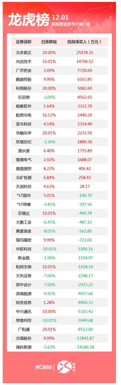 12月1日龙虎榜中,共34只个股出现了机构的身影,有16只股票呈现机构净买入,18只股票呈现机构净卖出。当天机构净买入前三的股票分别是北京君正、光启技术、广济药业;当天机构净卖出前三的股票分别是海科新源、杰瑞股份、广和通。