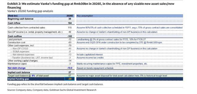 高盛在近期的一份研报中指出,万科(合并报表层面)在2026年的预计资金缺口约为300亿元人民币。当前局面的扭转,取决于银行或其主要股东能否提供更多支持。