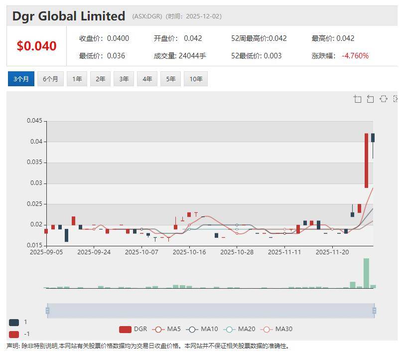 澳华财经在线数据库显示,DGR最新价0.042澳元,已发行股本10.4亿股,市值4384万澳元。