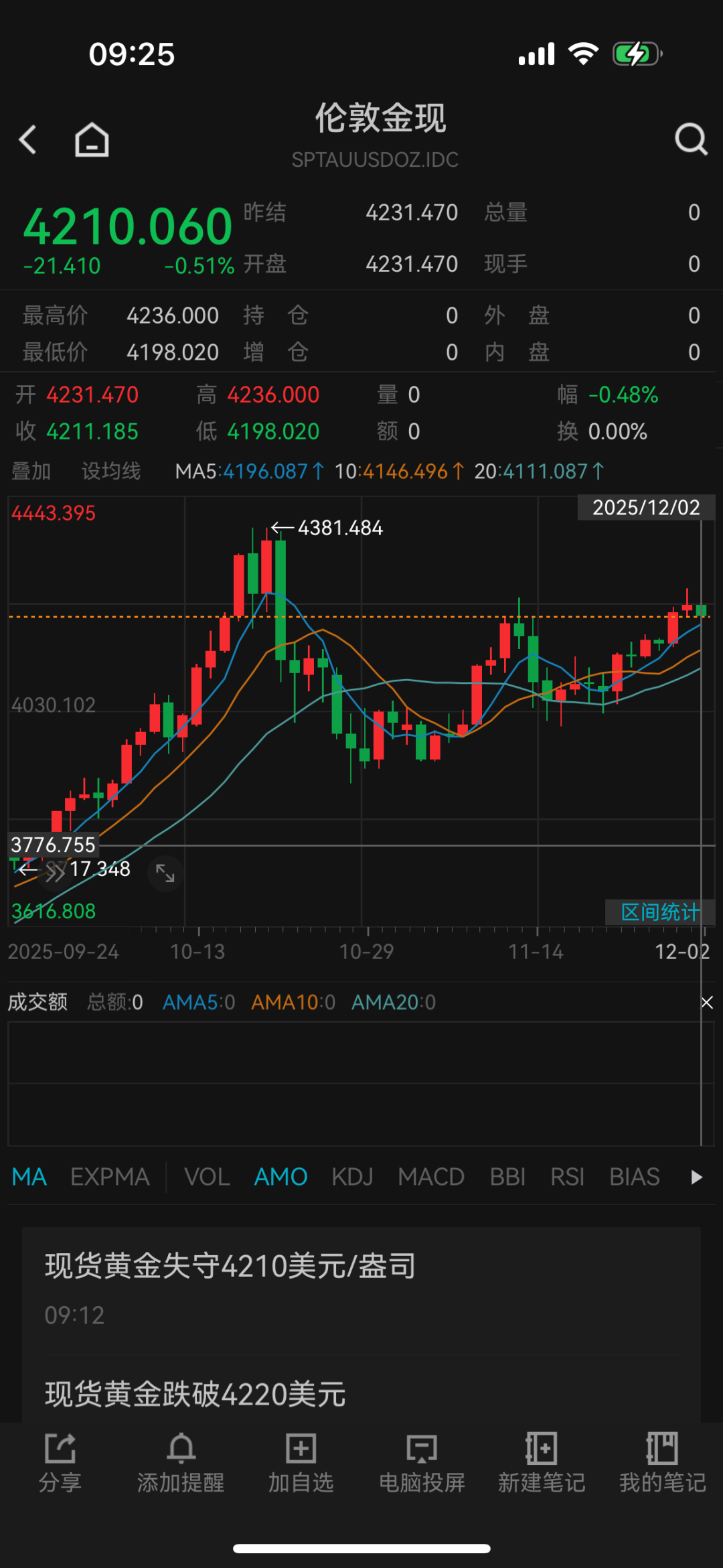 在现货白银下挫的同时,伦敦现货黄金也震荡走低,截至发稿时,现货黄金下跌0.5%,交投于4210美元/盎司附近。