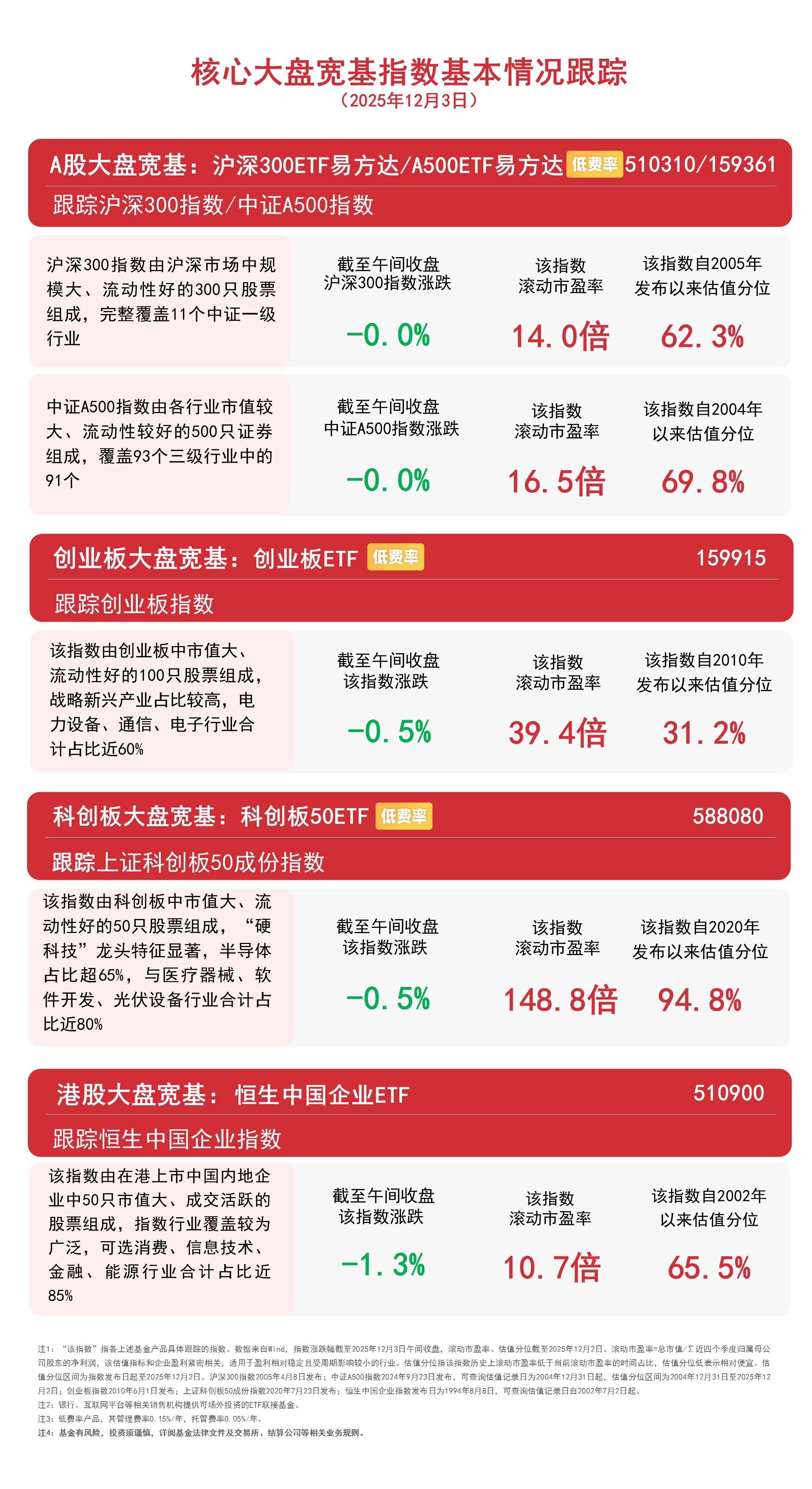 A股三大指数早盘集体震荡,沪指微跌0.1%,板块题材方面,有色金属、煤炭、能源设备板块涨幅居前,软件、互联网、教育板块跌幅居前;港股回调,有色金属板块逆势走强,创新药、科技板块延续调整。截至午间收盘,中证A500指数下跌0.04%,沪深300指数下跌0.01%,创业板指数下跌0.5%,上证科创板50成份指数下跌0.5%,恒生中国企业指数下跌1.3%。