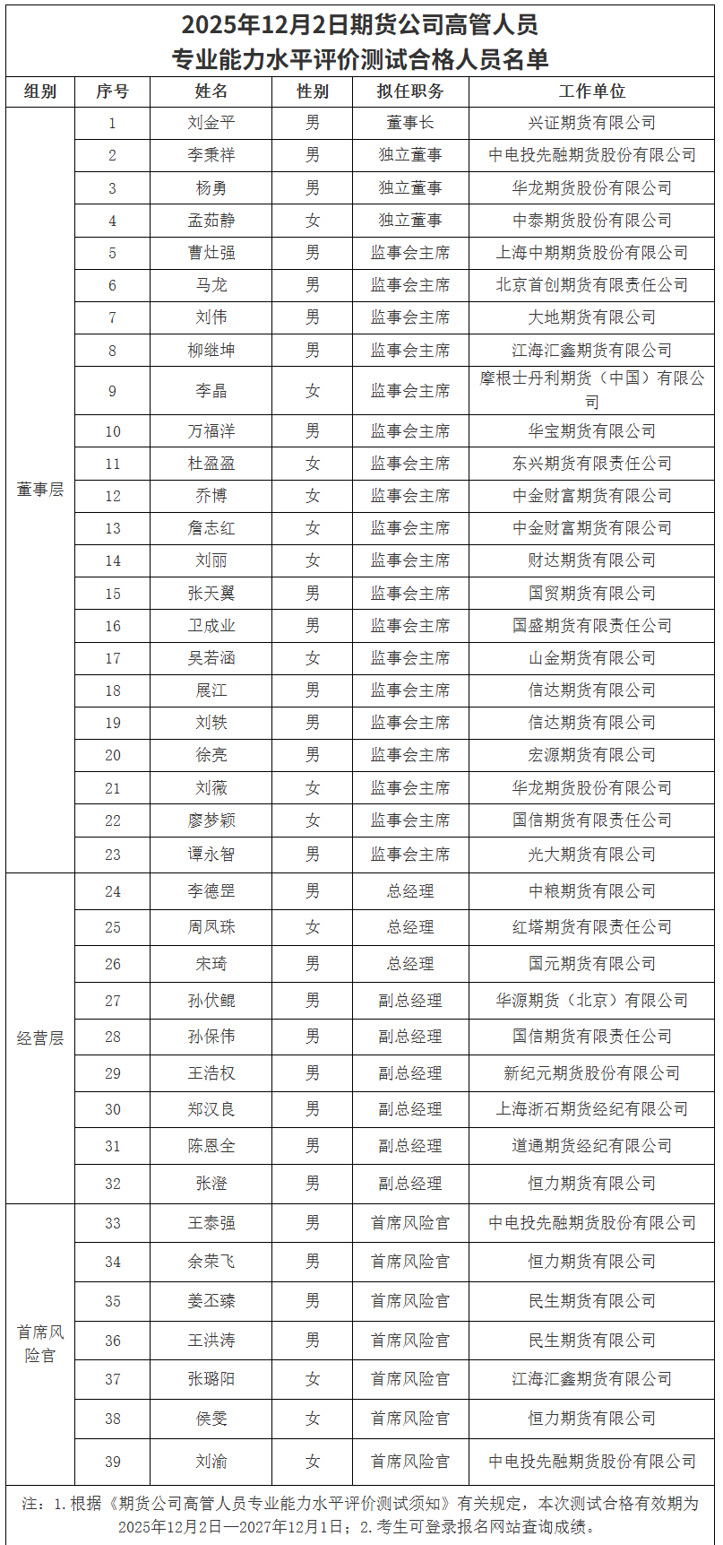 上证报中国证券网讯(记者 费天元)中国期货业协会日前发布“2025年12月2日期货公司高管人员专业能力水平评价测试合格人员名单”,兴证期货拟任董事长刘金平通过专业能力测试。同时通过测试的还有中粮期货拟任总经理李德罡、红塔期货拟任总经理周凤珠、国元期货拟任总经理宋琦。