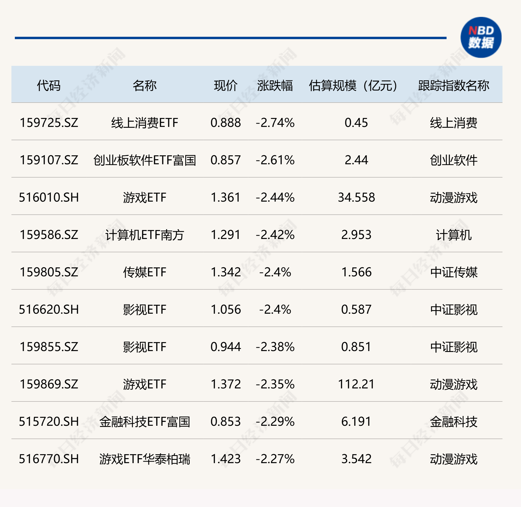 下跌方面,线上消费、游戏、传媒等相关ETF跌超2%。