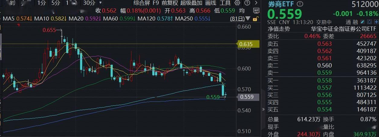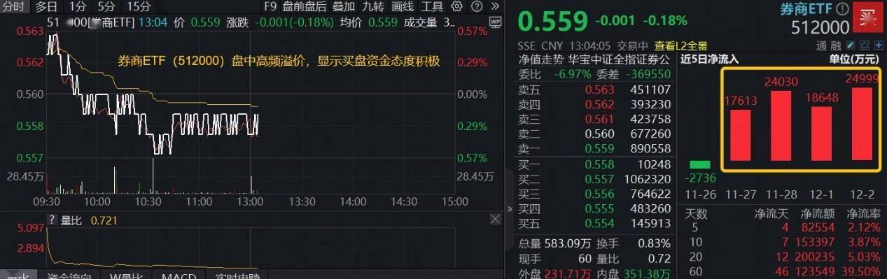 12月3日,券商板块随市震荡,390亿顶流券商ETF(512000)场内价格现跌0.18%,下探8月26日以来的本轮调整新低。