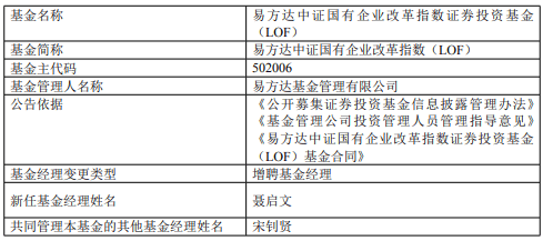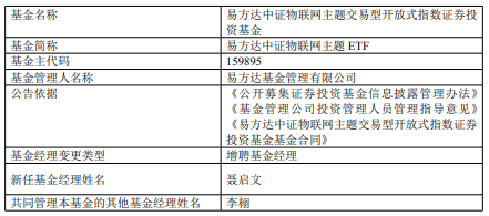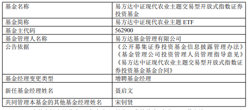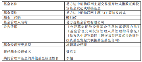 中国经济网北京12月3日讯 今日,易方达基金公告,易方达中证物联网主题ETF、易方达中证物联网主题ETF联接发起式、易方达中证国有企业改革指数(LOF)、易方达中证现代农业主题ETF增聘聂启文。