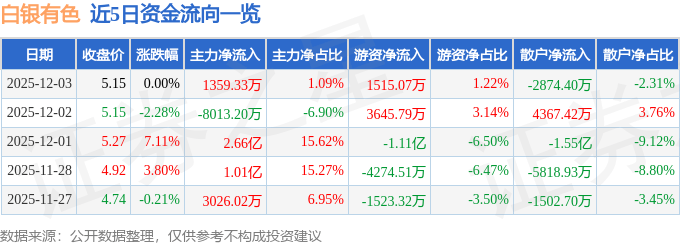 证券之星消息,截至2025年12月3日收盘,白银有色(601212)报收于5.15元,上涨0.0%,换手率3.23%,成交量239.03万手,成交额12.45亿元。