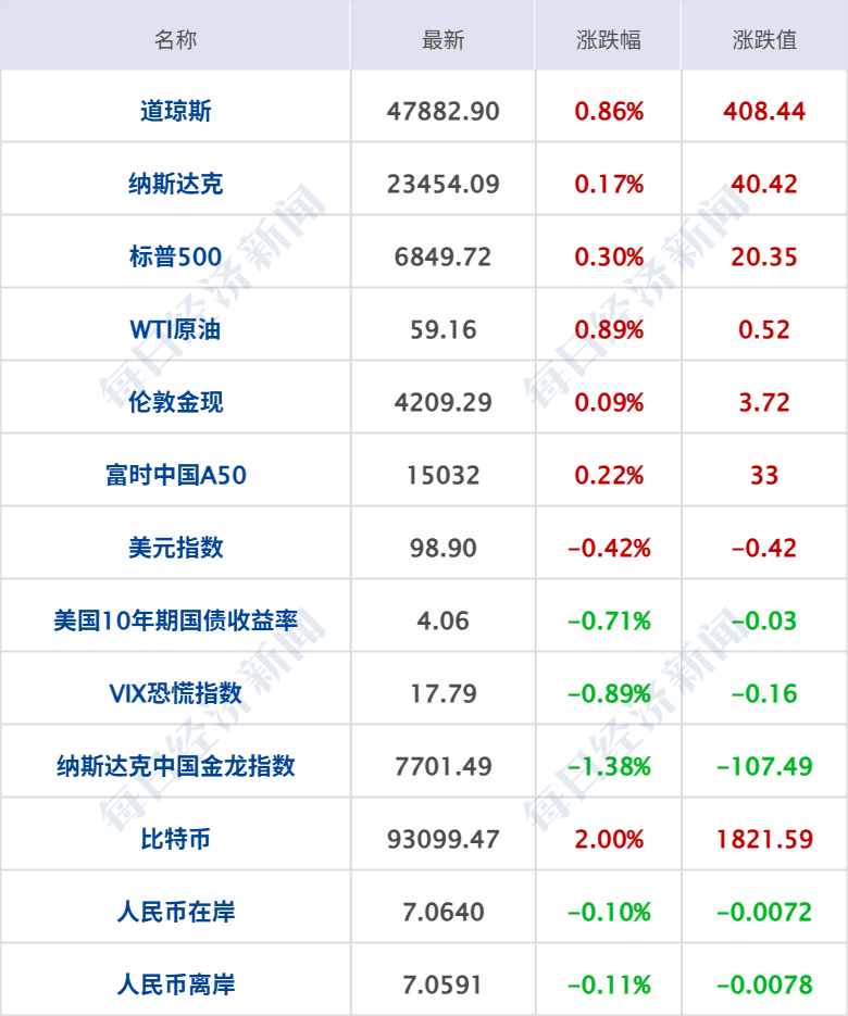 美股三大指数集体收涨,道指涨0.86%,纳指涨0.17%,标普500指数涨0.3%,大型科技股涨跌不一,特斯拉涨超4%,谷歌涨超1%,微软跌超2%,Meta、英伟达跌超1%;有色金属、加密储备概念股涨幅居前,美国铝业公司涨超6%,Coinbase、凯撒铝业涨超5%,Strategy涨超3%;存储概念股、锂矿股走低,SanDisk跌超5%,Lithium、美光科技、西部数据跌超2%。纳斯达克中国金龙指数收跌1.38%,中概股多数下跌,蔚来、小鹏汽车跌超4%,理想汽车、新东方跌超3%,哔哩哔哩、名创优品跌超2%,阿里巴巴、百度、拼多多跌超1%,世纪互联涨超1%。