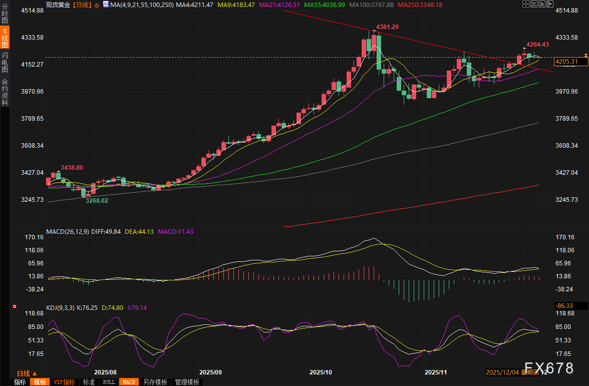 汇通财经APP讯——周四(12月4日)亚市早盘,现货窄幅震荡,目前交投于4205美元/盎司附近。周三国际金市呈现出持稳态势,黄金价格大多数时间稳定在每盎司4200上方,疲软的美国就业数据一度帮助金价盘中触及4241.40美元的高点,但尾盘回吐涨幅,收报4203美元附近,接近收平。与此同时,价格周三刷新历史高点,盘中一度达到58.95美元,仍为黄金提供了支撑,也反映出市场对美联储降息的强烈预期,推动美国债市收益率回落、美元走软以及股市上涨。随着美国劳动力市场意外下滑和美联储宽松政策信号日益明显,白银的强势飙升已点燃贵金属板块热情,而黄金作为传统避险资产,似乎正蓄势待发。