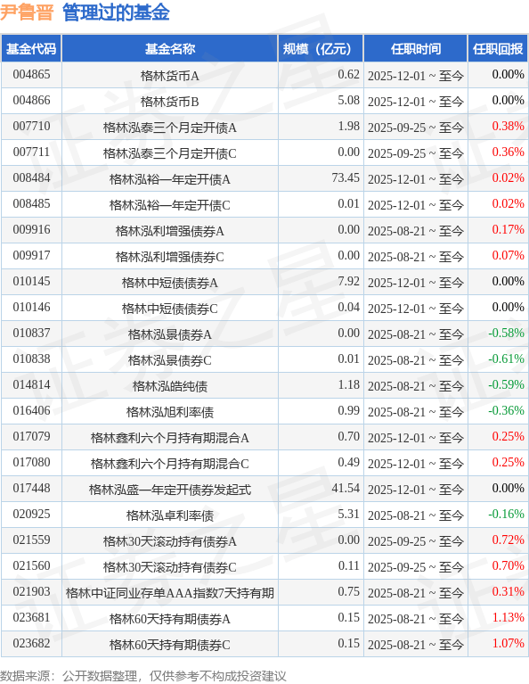 尹鲁晋先生:中国国籍,厦门大学王亚南经济研究院金融学博士。曾任山西晋城无烟煤矿业集团有限责任公司财务总部主办会计、渤海证券固定收益总部及债券融资总部高级副总裁、金圆统一证券投资银行部业务总监。2021年7月加入格林基金,曾任研究部信评总监、特定客户资产管理部投资经理,现任基金经理。2025年8月21日担任格林泓景债券型证券投资基金、格林中证同业存单AAA指数7天持有期证券投资基金、格林60天持有期债券型证券投资基金、格林泓旭利率债债券型证券投资基金、格林泓利增强债券型证券投资基金基金经理、格林泓皓纯债债券型证券投资基金基金经理。2025年9月25日担任格林30天滚动持有债券型证券投资基金基金经理。