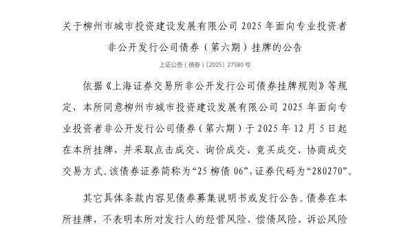 12月4日,上交所发布关于柳州市城市投资建设发展有限公司2025年面向专业投资者非公开发行公司债券(第六期)挂牌的公告。