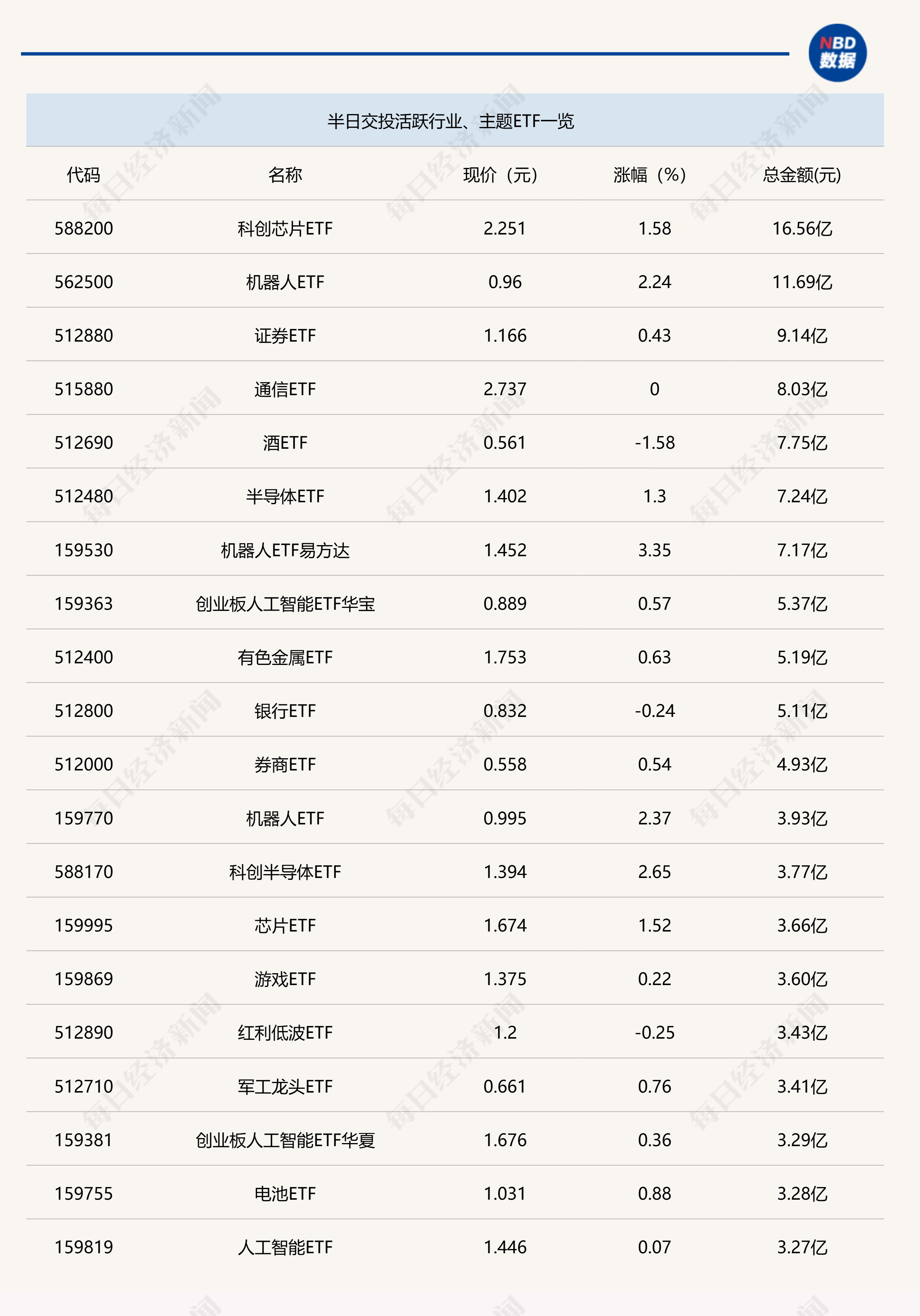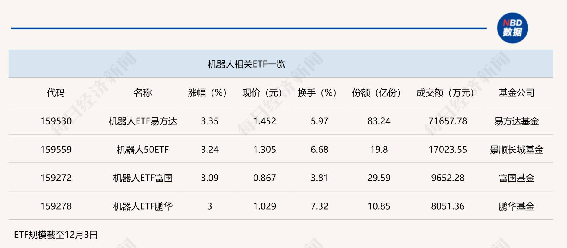 点评:机器人ETF易方达(159530)今日上午大涨3.35%,该ETF份额为83.24亿份,半日成交金额达到7.17亿元,其追踪的是国证机器人产业指数。追踪该指数的ETF还有机器人50ETF(159559),该ETF半日涨幅也达到3.24%,半日成交金额为1.7亿元。