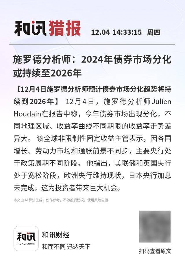 【12月4日施罗德分析师预计债券市场分化趋势将持续到2026年】12月4日,施罗德分析师Julien HoudAIn在报告中称,今年债券市场出现分化,不同地理区域、收益率曲线不同期限的收益率走势差异大。该全球非限制性固定收益主管表示,因各国增长、劳动力市场和通胀前景不同步,主要央行处于政策周期不同阶段。他指出,美联储和英国央行处于宽松阶段,欧洲央行维持现状,日本央行加息未完成,这为投资者带来巨大机会。