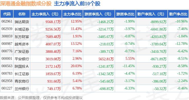 资金流向方面,深港通金融(983025)指数成份股当日主力资金净流入合计1.47亿元,游资资金净流入合计152.25万元,散户资金净流出合计1.48亿元。成份股资金流向详情见下表: