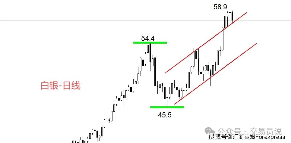 技术角度看,日线级别,白银仍处于中长期多头趋势,不建议过度看空。中期顶部在54.4美元,中期底部在45.5美元。市场行情正在寻找下一个中期顶部,本周高点58.9美元有可能成为中期顶部,但需要未来数日行情跌至通道内部。今日白银盘中持续下跌,但美盘时段尚未到来,最终的K线形态仍无法确定。考虑到美联储将于本月10日公布利率决议结果,且大概率是降息25基点,白银仍存在继续上涨的动力,58.9是否能成为中期高点仍存疑。