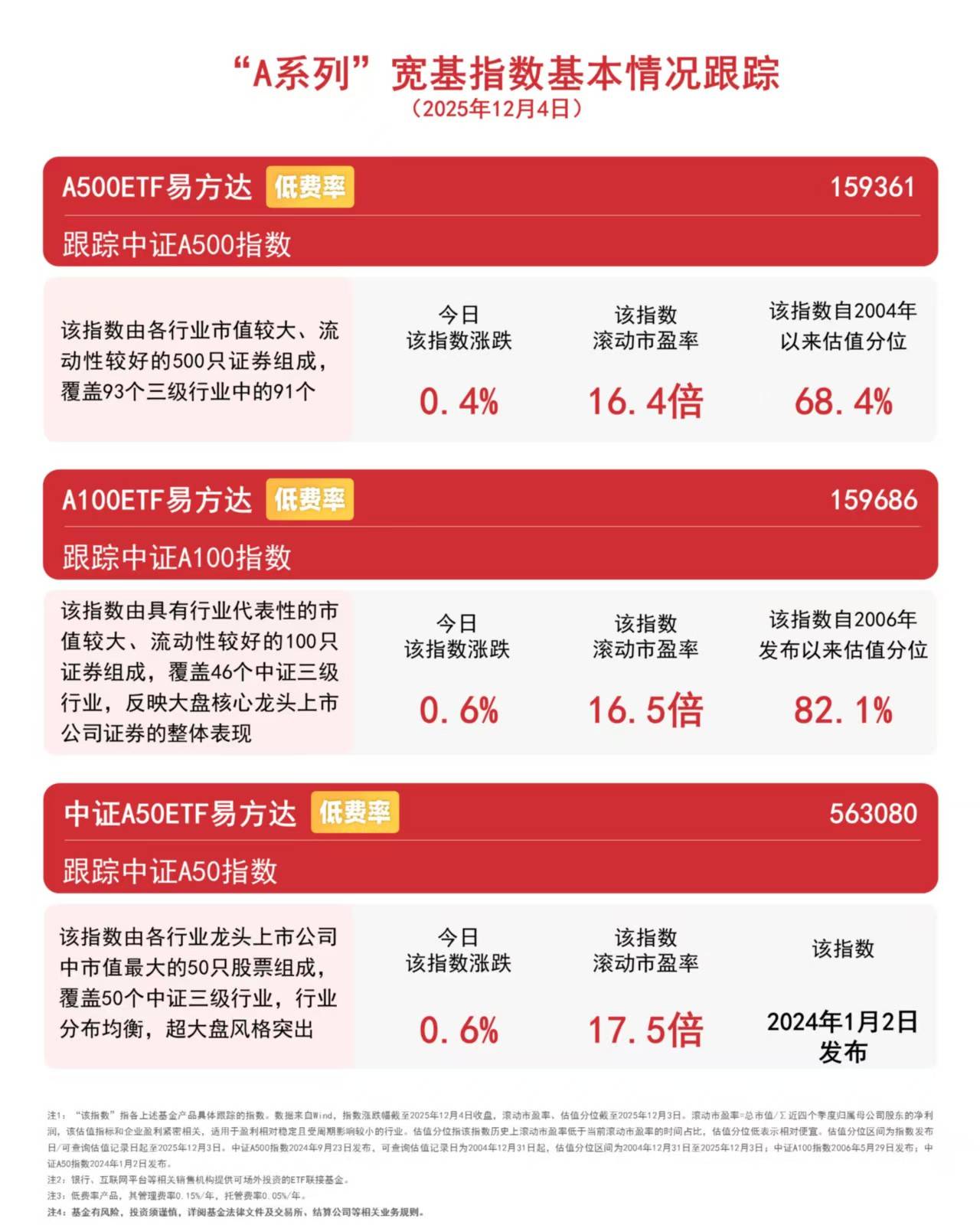 截至收盘,中证A500指数上涨0.4%,中证A100指数、中证A50指数均上涨0.6%,A500ETF易方达(159361)全天成交额近45亿元。