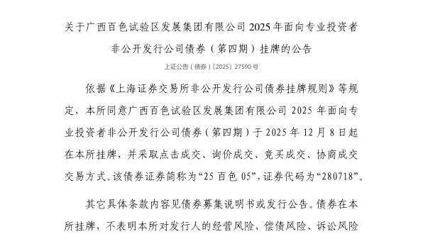 12月5日,上交所发布关于广西百色试验区发展集团有限公司2025年面向专业投资者非公开发行公司债券(第四期)挂牌的公告。