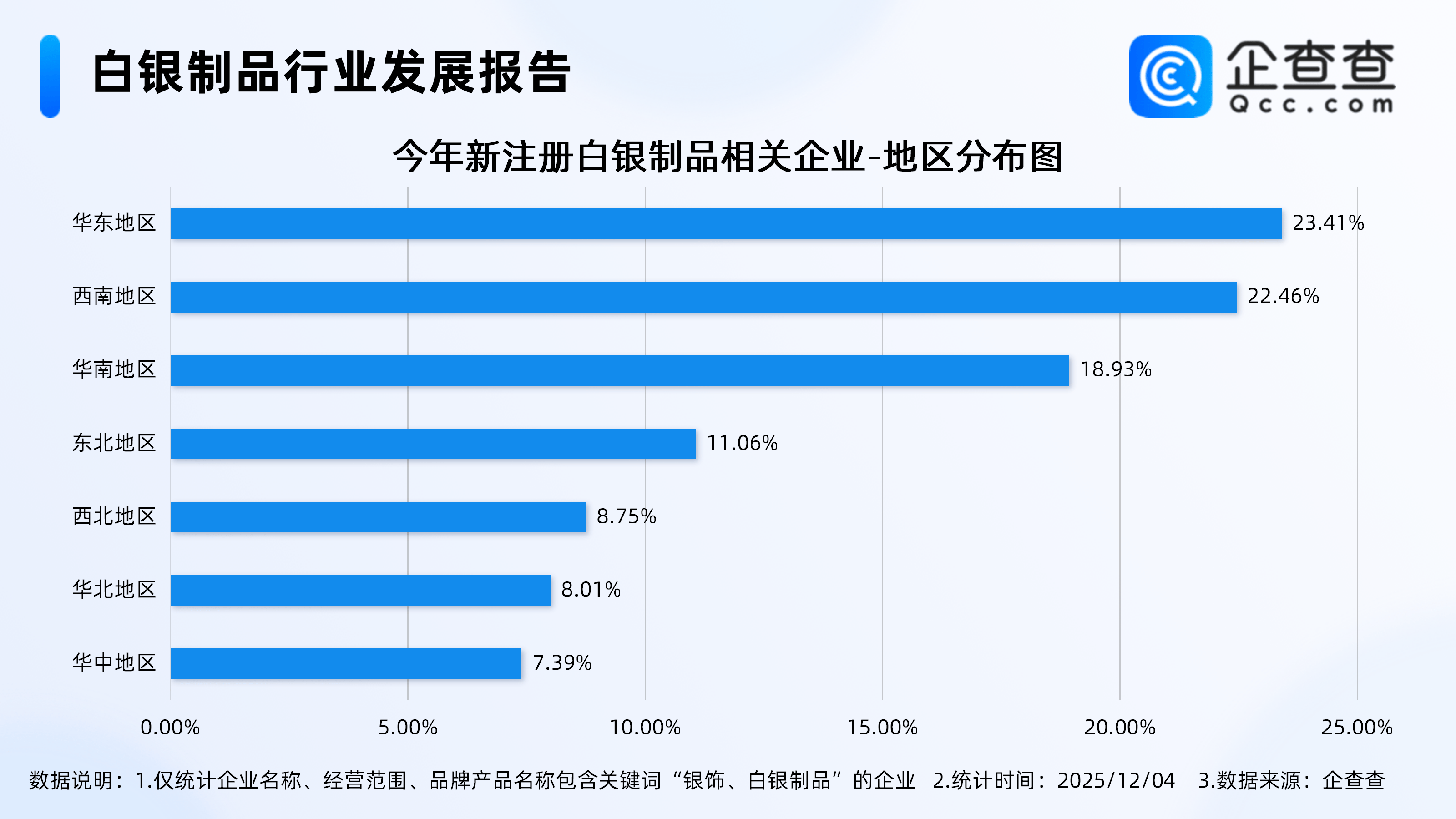 企查查数据显示,注册量方面,2024年全年注册1620家相关企业,截至目前,今年已注册1474家。从地区分布来看,今年新注册的白银制品相关企业多分布在华东地区、西南地区、华南地区,分别占比23.41%、22.46%、18.93%。西北地区、华北地区、华中地区今年新注册相关企业贡献率均不足10%。