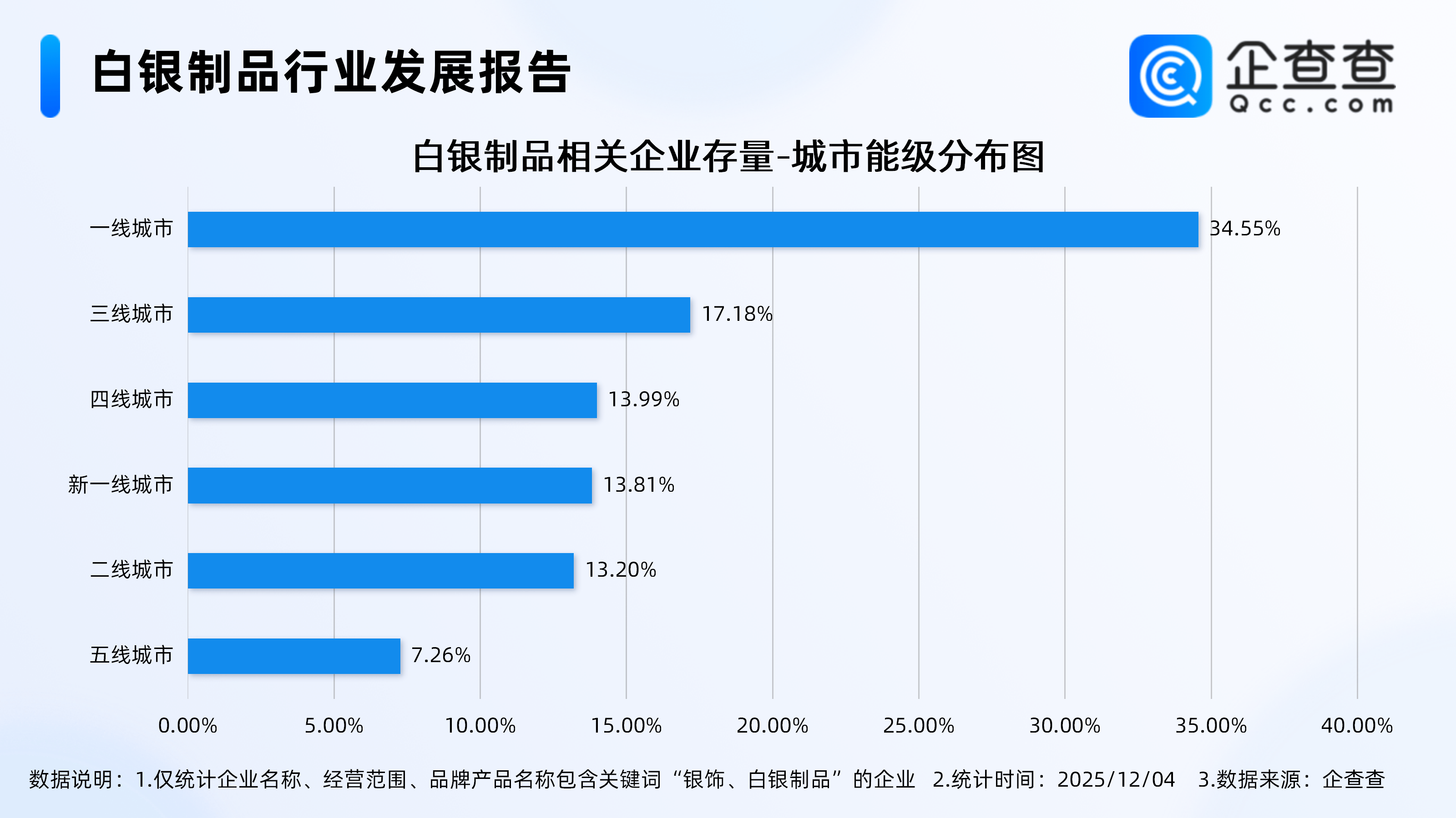 企查查数据显示,从城市能级分布来看,分布在一线城市的白银制品相关企业最多,占比34.55%。其次,分布在三线城市、四线城市的相关企业分别占比17.18%、13.99%。