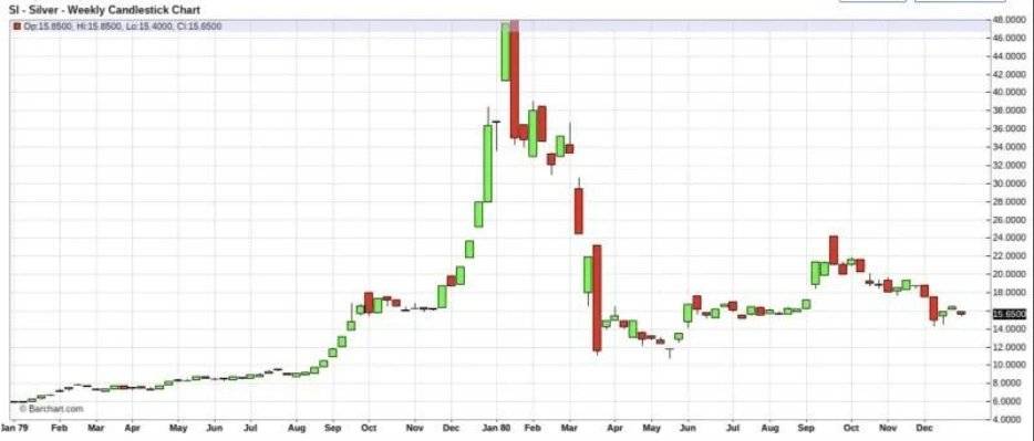 1980年,白银在四个月内从10美元飙升至48美元,但两个月后又跌回10美元。