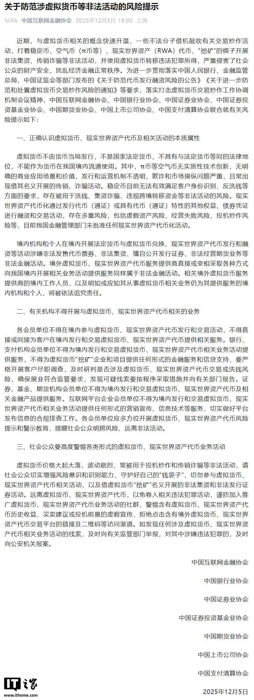 IT之家从公告获悉,为进一步贯彻落实中国人民银行、金融监管总局、中国证监会等部门发布的《关于防范代币发行融资风险的公告》《关于进一步防范和处置虚拟货币交易炒作风险的通知》等要求,落实打击虚拟货币交易炒作工作协调机制会议精神,中国互联网金融协会、中国银行业协会、中国证券业协会、中国证券投资基金业协会、中国期货业协会、中国上市公司协会、中国支付清算协会联合就有关风险提示如下: